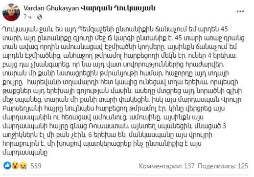 «Հանրային ձայն» հաղորդման հեղինակ Վարդան Ղուկասյանը ֆեյսբուքյան իր էջում տեղադրել է Պեմզաշենում տեղի ունեցած դաժան սպանության մեջ կասկածվող մարդասպանի ընտանիքի մասին ստացված նամակը: Ահա, թե ինչ է գրել այդ ընտանիքին 45 տարի ճանաչողներից մեկը: