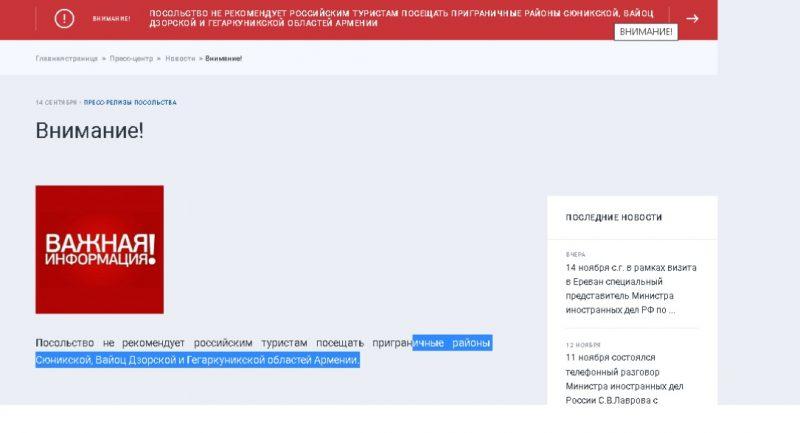 Մասնավորապես, ՌԴ դեսպանատունը ռուս զբոսաշրջիկներին խորհուրդ չի տալիս այցելել ՀՀ Սյունիքի, Վայոց Ձորի և Գեղարքունիքի մարզեր։ Սակայն այս տեղեկատվությունը թվագրվում է սեպտեմբերի 14-ով, թեև մինչև այժմ երևում է դեսպանատան գլխավոր էջում։