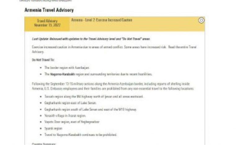 ԱՄՆ դեսպանատան հաղորդագրությունում, որը արվել է նոյեմբերի 15-ին, Հայաստանում դեսպանատան աշխատակիցներին և նրանց ընտանիքներին կոչ է արվում չայցելել Հայաստանի հինգ մարզերի և Ղարաբաղի որոշ տարածքներ, եթե խիստ անհրաժեշտություն չկա։