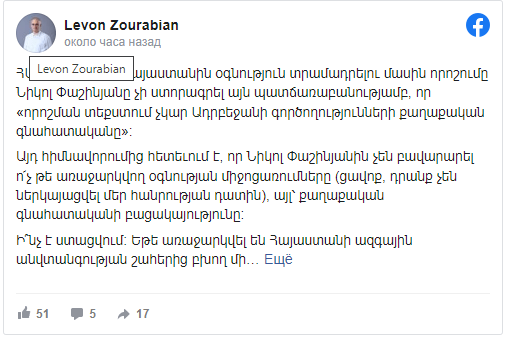 Այդ հիմնավորումից հետևում է, որ Նիկոլ Փաշինյանին չեն բավարարել ոչ թե առաջարկվող օգնության միջոցառումները (ցավոք, դրանք չեն ներկայացվել մեր հանրության դատին), այլ՝ քաղաքական գնահատականի բացակայությունը։