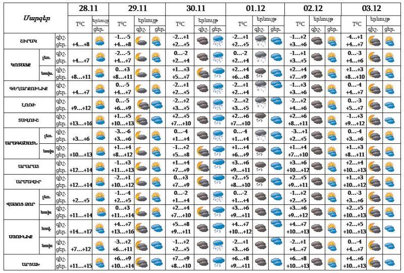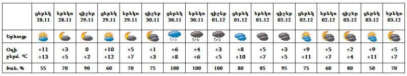 Նոյեմբերի 28-ի ցերեկը, 29-ին, 30-ի գիշերը, դեկտեմբերի 1-ի ցերեկը, 2-3-ը սպասվում է առանց տեղումների եղանակ: Նոյեմբերի 30-ի ցերեկը, դեկտեմբերի 1-ի գիշերը սպասվում է անձրև: