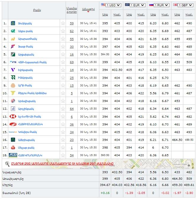 Ըստ այդ տվյալների՝ նոյեմբերի 30-ի առավոտից հանրապետության առևտրային բանկերն ԱՄՆ դոլարը գնում են 391,24 դրամ միջին գնով, նախորդ աշխատանքային օրվա համեմատ ամերիկյան արժույթն ավելացել է 0,10 դրամով։ Ամերիկյան արժույթը վաճառվում է 397.91 դրամ միջին գնով, երեկվա համեմատ դոլարը մնացել է անփոփոխ։