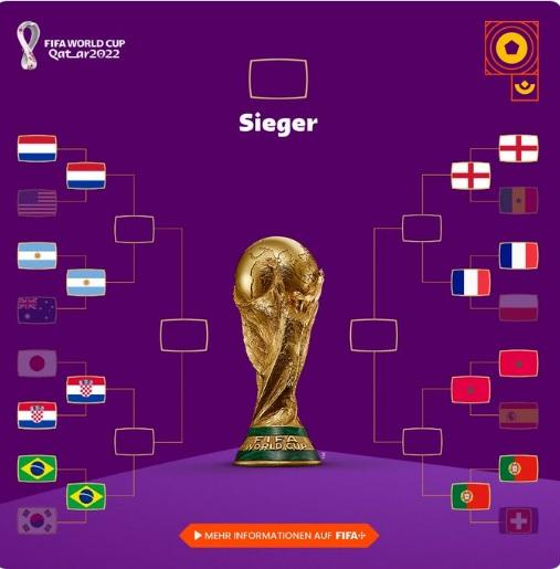 Աշխարհի չեմպիոն Ֆրանսիան կմրցի Եվրոպայի փոխչեմպիոն Անգլիայի, աշխարհի փոխչեմպիոն Խորվաթիան՝ Բրազիլիայի հետ։ Ամերիկայի գավաթակիր Արգենտինայի մրցակիցը կլինի Նիդեռլանդների թիմը։ Վերջին զույգն էլ կազմեցին Մարոկկոն ու Պորտուգալիան։