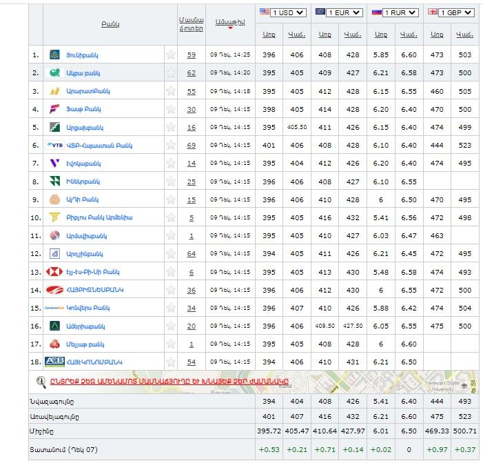 Ըստ այդ տվյալների՝ դեկտեմբերի 9-ի առավոտից հանրապետության առևտրային բանկերն ԱՄՆ դոլարը գնում են 391,22 դրամ միջին գնով, նախորդ աշխատանքային օրվա համեմատ ԱՄՆ արժույթն ավելացել է 0,21 դրամով։ Ամերիկյան արժույթը վաճառվում է 397.83 դրամ միջին գնով, երեկվա համեմատ դոլարը թանկացել է 0.21 դրամով։