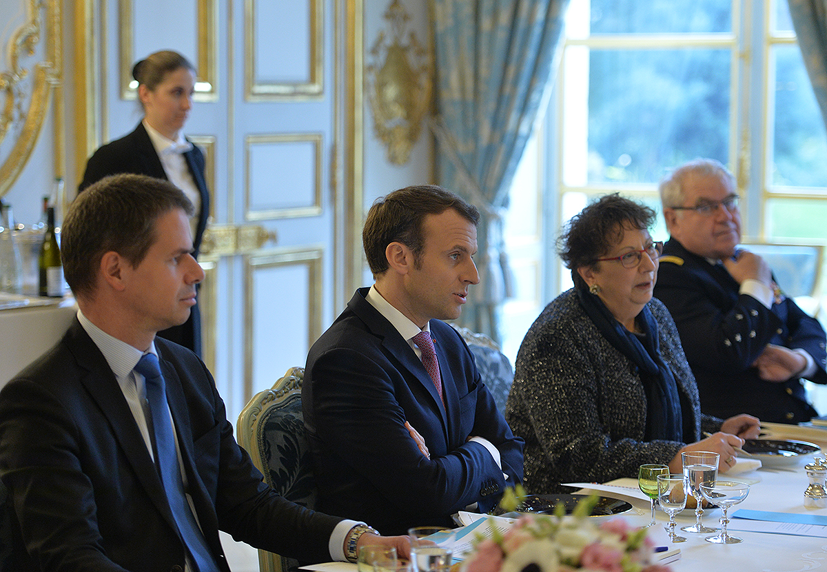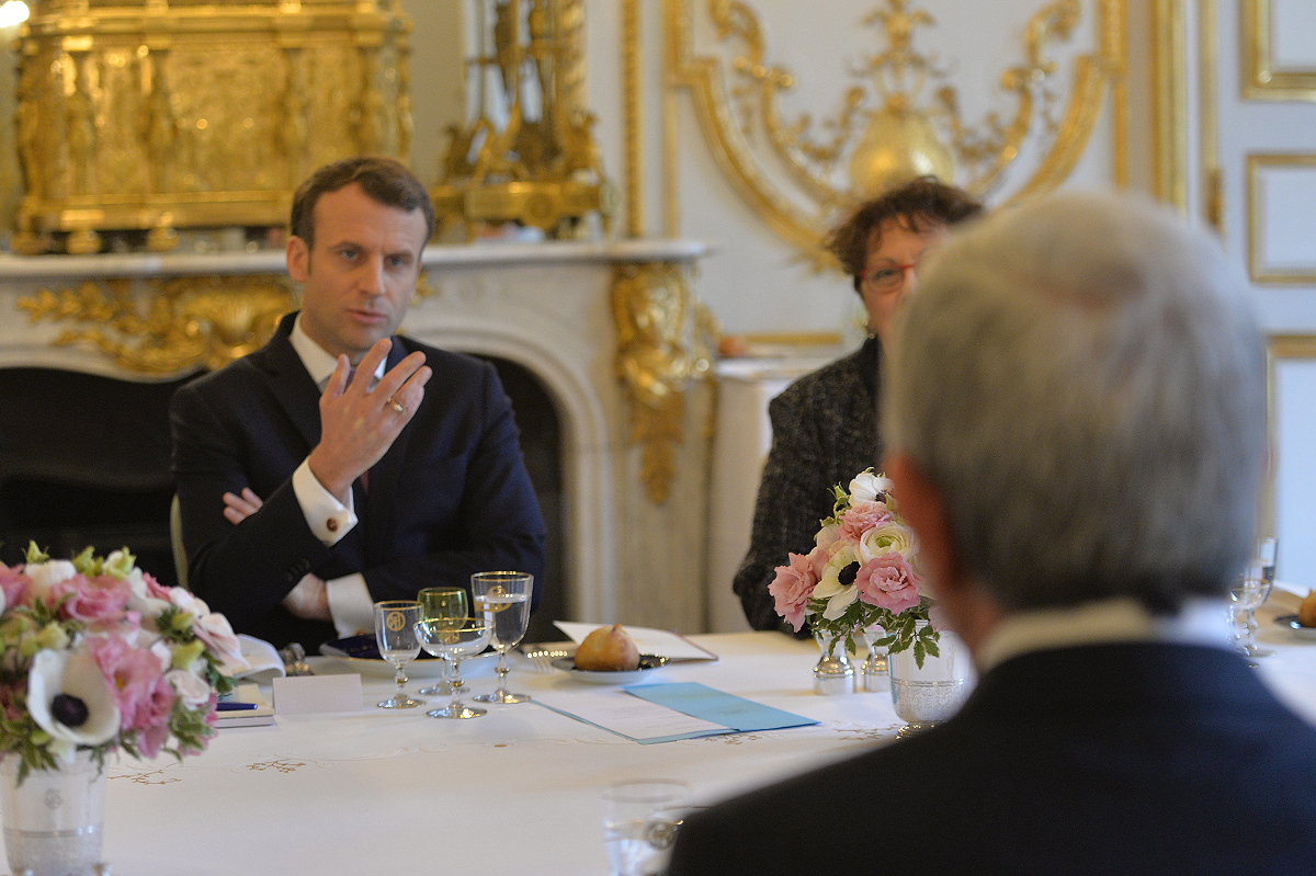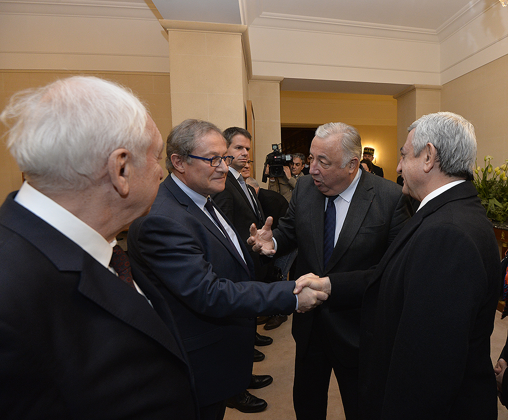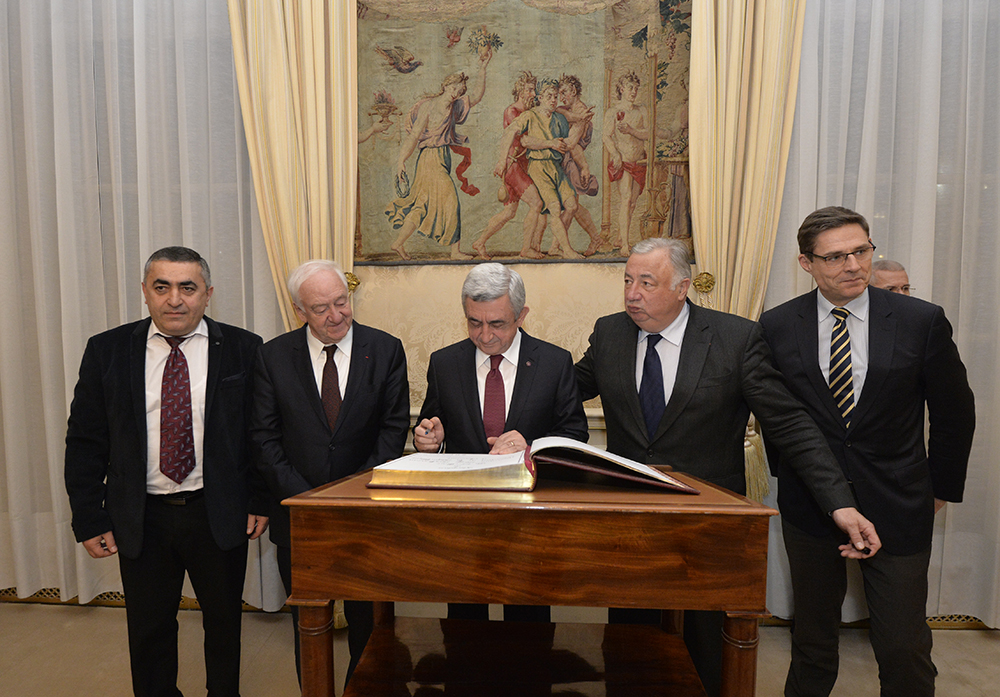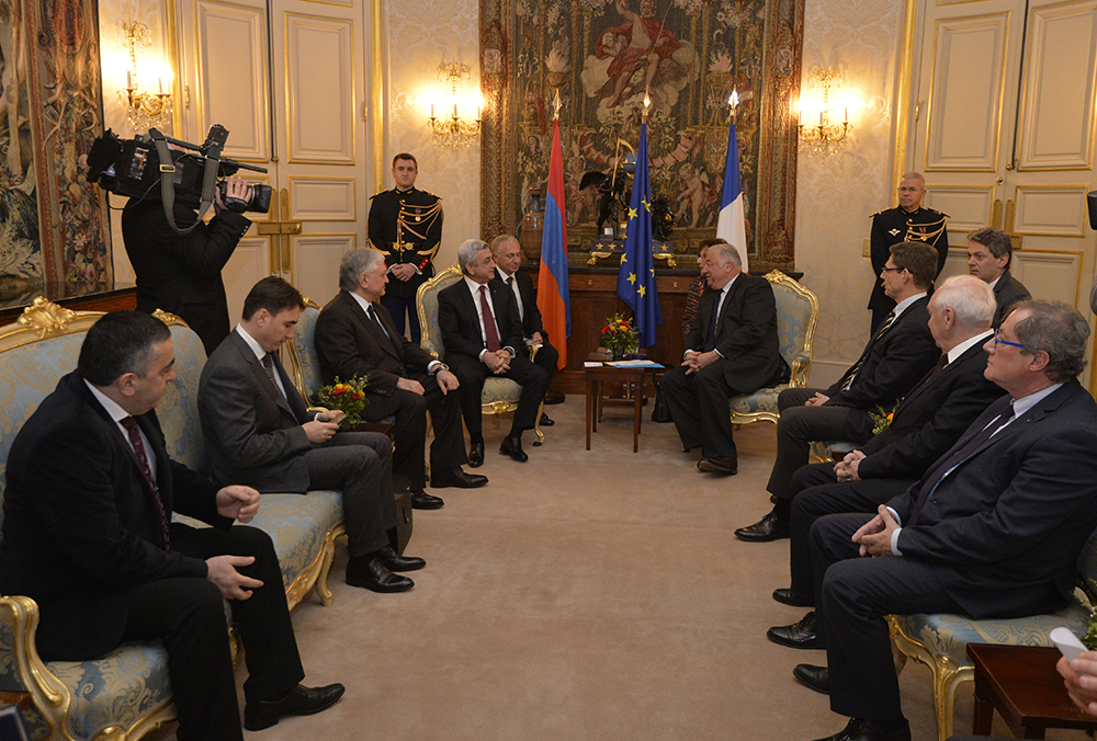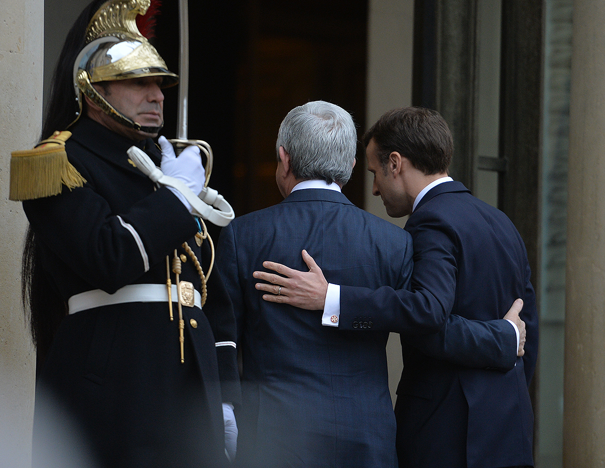 Նախագահ Մակրոնը ողջունել է Հայաստանի Նախագահին Ֆրանսիայում և նշել, որ հանդիպման ժամանակ ակնկալում է հայ-ֆրանսիական բարեկամական հարաբերություններից բացի քննարկել բազմակողմ ձևաչափով, այդ թվում՝ Ֆրանկոֆոնիայի շրջանակներում համագործակցությունը, Հայաստան-Եվրամիություն հարաբերությունների հետագա զարգացումը ՀՀ-ԵՄ շրջանակային համաձայնագրի ստորագրումից հետո: Ֆրանսիայի նախագահը գործընկերոջից հետաքրքրվել է նաև ԼՂ հիմնախնդրի կարգավորման բանակցային գործընթացի վերջին զարգացումներով և այդ գործընթացն առաջ մղելու հնարավորությունների վերաբերյալ Նախագահ Սարգսյանի մոտեցումներով, ինչպես նաև տարածաշրջանի երկրների հետ Հայաստանի հարաբերություններով: