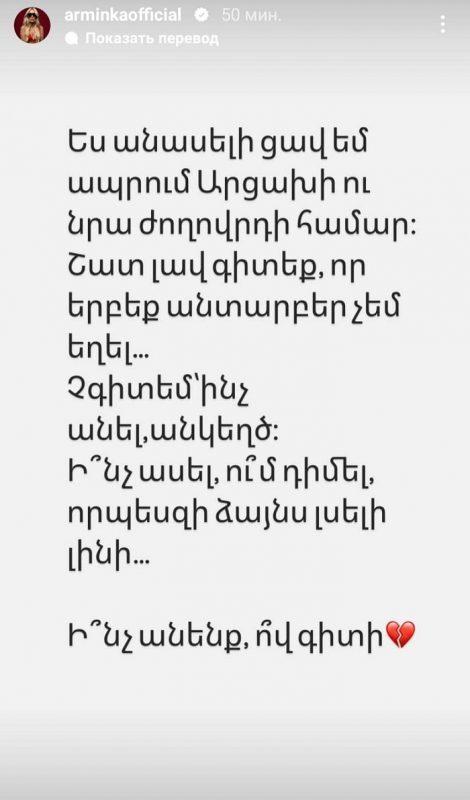 «Ինստագրամ» սոցիալական ցանցի իր էջի Stories բաժնում երգչուհին գրառում է կատարել՝ գրելով․ «Ես անասելի ցավ եմ ապրում Արցախի ու նրա ժողովրդի համար։ Շատ լավ գիտեք, որ երբեք անտարբեր չեն եղել․․․ Չգիտեմ՝ ինչ անել, անկեղծ։ Ի՞նչ ասել, ու՞մ դիմել, որպեսզի ձայնս լսելի լինի․․․ Ի՞նչ անենք, ո՞վ գիտի»։