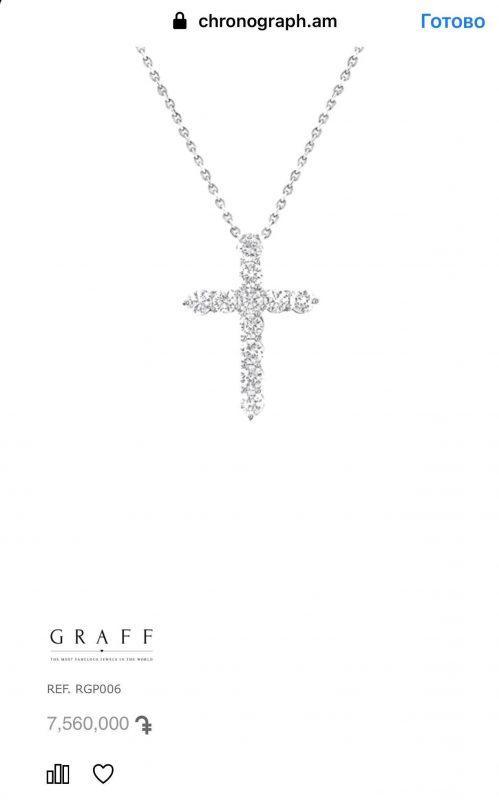Ավելի դժվար էր հասկանալ, թե ինչ խաչ է կրում տիկին Հակոբյանը, մեզ հաջողվեց պարզել, որ խաչը Graff բրենդի է, որը ներմուծում է մեկական օրինակով Խրոնոգրաֆ խանութը։ Մեզ ասացին, որ վաճառվելու դեպքում զարդը հանվում է խանութի կայքից, բայց նմանատիպ խաչեր Graff-ից դեռ կան կայքում: Տիկին Հակոբյանի խաչի ադամանդները ավելի մեծ են, քան կայքում առկաները, հետևաբար՝ նրա խաչի գինը կարող է տատանվել 7 միլիոն 560 հազար դրամից մինչև 11 միլիոն դրամ, կախված ադամադների որակից:
