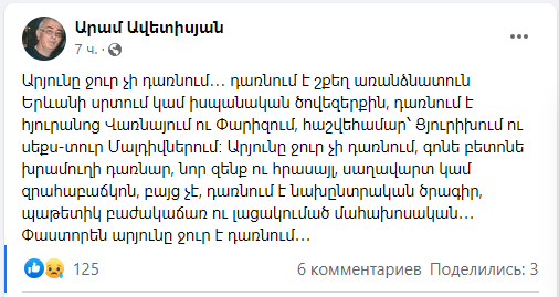 Արյունը ջուր չի դառնում, գոնե բետոնե խրամուղի դառնար, նոր զենք ու հրասայլ, սաղավարտ կամ զրահաբաճկոն, բայց չէ, դառնում է նախընտրական ծրագիր, պաթետիկ բաժակաճառ ու լացակումած մահախոսական․․․ Փաստորեն արյունը ջուր է դառնում․․․