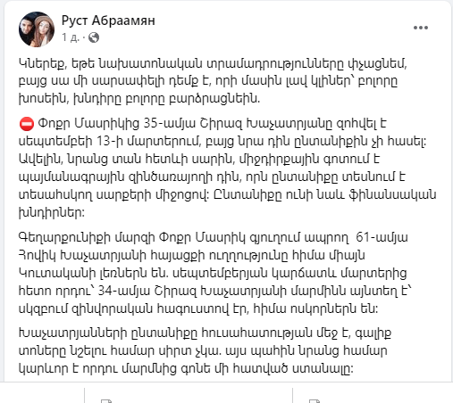 Փոքր Մասրիկից 35-ամյա Շիրազ Խաչատրյանը զոհվել է սեպտեմբեի 13-ի մարտերում, բայց նրա դին ընտանիքին չի հասել: Ավելին, նրանց տան հետևի սարին, միջդիրքային գոտում է պայմանագրային զինծառայողի դին, որն ընտանիքը տեսնում է տեսահսկող սարքերի միջոցով: Ընտանիքը ունի նաև ֆինանսական խնդիրներ: