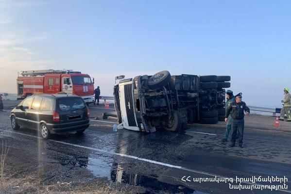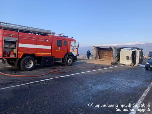 Պարզվել է, որ «MAZ» մակնիշի բեռնատարը (վարորդ՝ Ա․ Տ․, ծնված 1992 թ․) ճանապարհի երթևեկելի հատվածում կողաշրջվել է․ առկա է վառելիքի արտահոսք, կա տուժած։