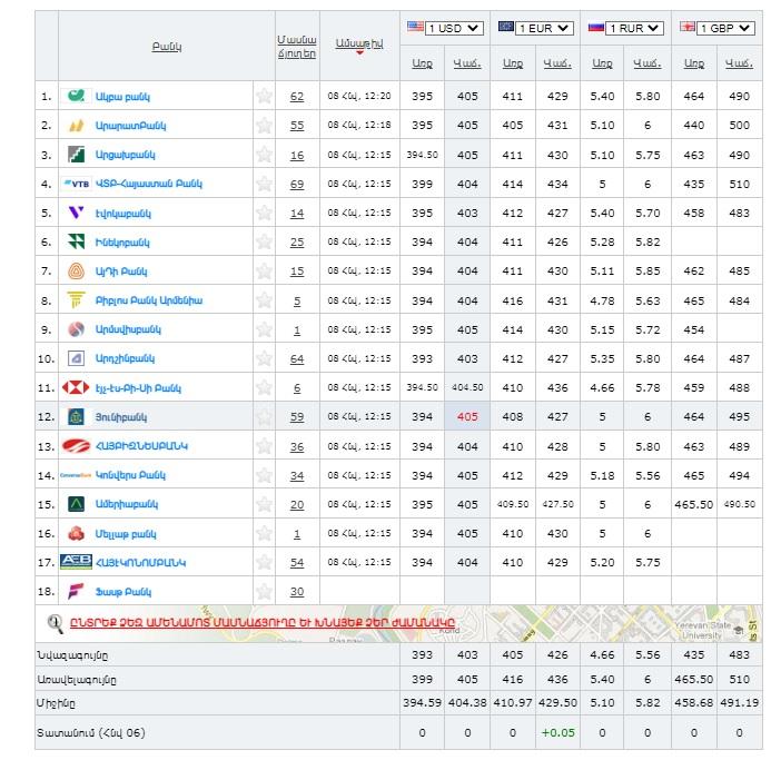 Հունվարի 8-ին դրությամբ Հայաստանում գործող բանկերը բանկերը ԱՄՆ դոլարը գնում են նվազագույնը 393, առավելագույնը՝ 399 դրամով, վաճառում՝ նվազագույնը 403 դրամով, առավելագույնը՝ 405 դրամով։ Այս մասին են վկայում rate.am կայքի տվյալները։