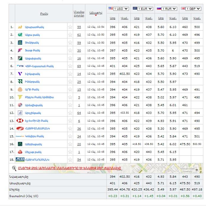 Մեկ դոլարը գնվում է 394 դրամ նվազագույն և 401 դրամ առավելագույն փոխարժեքով, վաճառվում՝ 402.50 դրամ նվազագույն և 406 դրամ առավելագույն փոխարժեքով:
