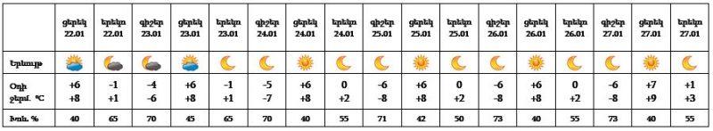 Հունվարի 22-ի ցերեկը, 23-27-ը սպասվում է առանց տեղումների եղանակ: