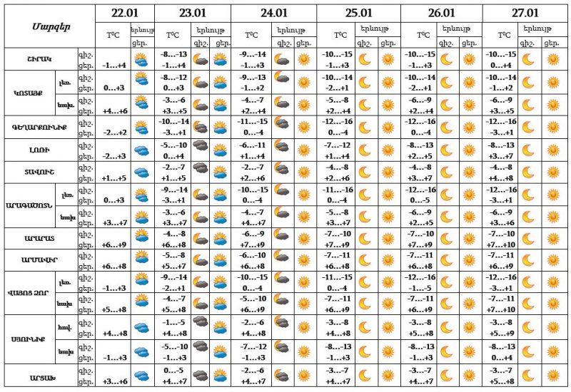 Հունվարի 22-ի ցերեկը Լոռիում և Տավուշում՝ առանձին հատվածներում, հնարավոր է թույլ ձյուն։ Հունվարի 23-27-ը սպասվում է առանց տեղումների եղանակ:
