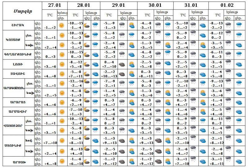 Հունվարի 27-ի ցերեկը, 28-ի գիշերը, սպասվում է առանց տեղումների եղանակ: Հունվարի 28-31-ը, փետրվարի 1-ին ժամանակ առ ժամանակ դադարներով սպասվում է թույլ ձյուն: