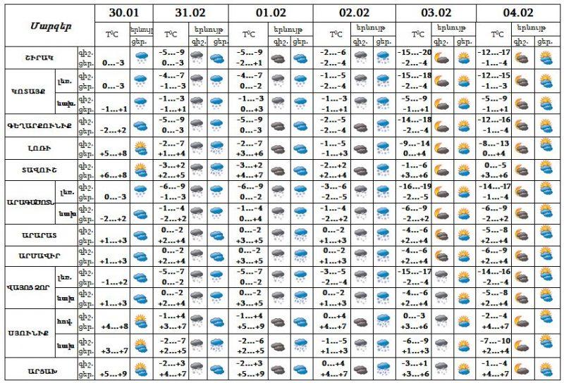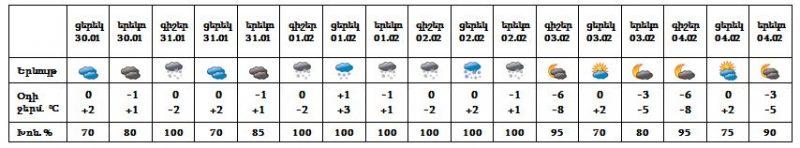 Հունվարի 30-ի ցերեկը, 31-ին, փետրվարի 1-ին, 3-ի գիշերն առանձին շրջաններում, 2-ին շրջանների մեծ մասում ժամանակ առ ժամանակ սպասվում է ձյուն և մառախուղ։
