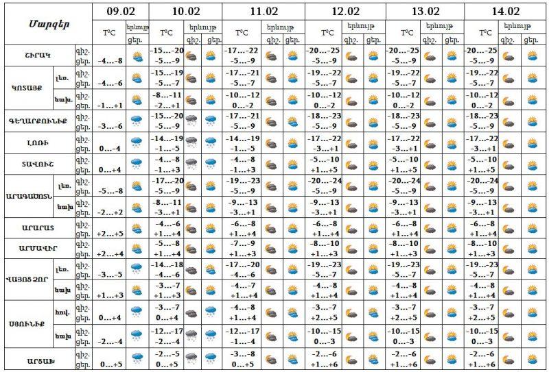 Փետրվարի 9-ի ցերեկը, 10-ին առանձին շրջաններում սպասվում է թույլ ձյուն և մառախուղ։ Փետրվարի 11-14-ը սպասվում է առանց տեղումների եղանակ: