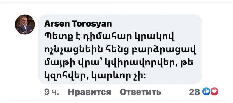 «Պետք է դիմահար կրակով ոչնչացնեին հենց բարձրացավ մայթի վրա՝ կվիրավորվեր, թե կզոհվեր, կարևոր չի»,- ֆեյսբուքյան մեկնաբանությունում գրել է Թորոսյանը։