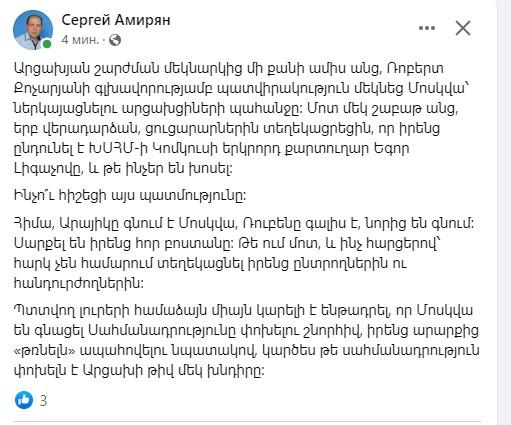 Արցախում Նախագահի նախկին թեկնածու Սերգեյ Ամիրյանը գրում է․