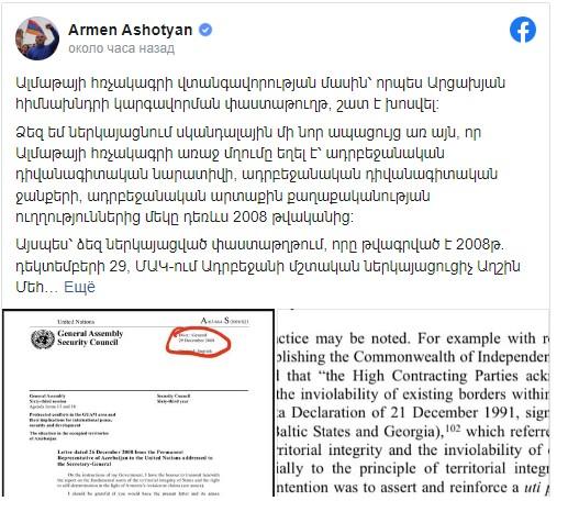 Ձեզ եմ ներկայացնում սկանդալային մի նոր ապացույց առ այն, որ Ալմաթայի հռչակագրի առաջ մղումը եղել է՝ ադրբեջանական դիվանագիտական նարատիվի, ադրբեջանական դիվանագիտական ջանքերի, ադրբեջանական արտաքին քաղաքականության ուղղություններից մեկը դեռևս 2008 թվականից: Այս մասին իր ֆեյսբուքյան էջում գրել է ՀՀԿ փոխնախագահ Արմեն Աշոտյանը: