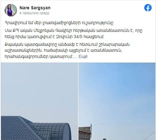 Նարե Սարգսյանը նաև դիմել էր լրատվամիջոցներին, խնդրելով հարցում ուղարկել ՔՊ-ական սույն պատգամավորին, թե ինչ միջոցներով է կառուցում իր հերթական շքեղ պալատը։