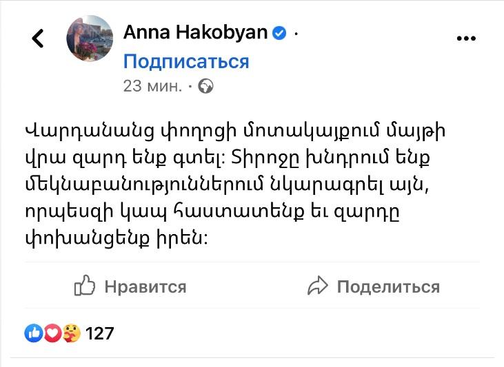 «Վարդանանց փողոցի մոտակայքում մայթի վրա զարդ ենք գտել։ Տիրոջը խնդրում ենք մեկնաբանություններում նկարագրել այն, որպեսզի կապ հաստատենք եւ զարդը փոխանցենք իրեն»,- գրել է նա: