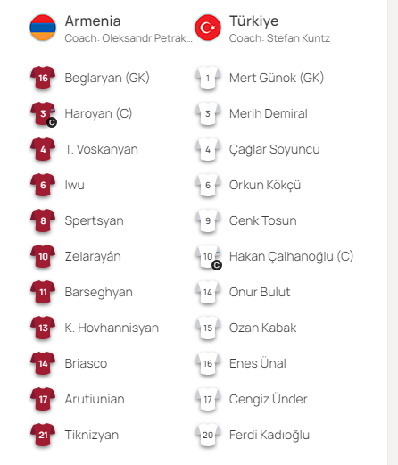 Այսօր Երևանի Վազգեն Սարգսյանի անվան «Հանրապետական» մարզադաշտում «ԵՎՐՈ-2024»-ի շրջանակներում կկայանա Հայաստան-Թուրքիա խաղը․ այն կմեկնարկի ժամը 21։00-ին։ Հանդիպումը կսպասարկի իսպանացի մրցավար Խոսե Մարիա Սանչես Մարտինեսը։ Մեկնարկային կազմերը հետևյալն են․