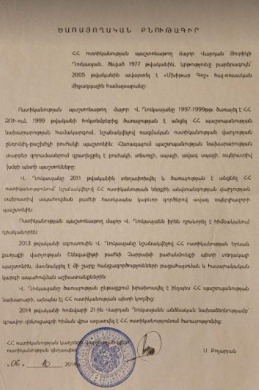 Իսկ հրապարակված ծառայողական բնութագրում նշվում է, որ մայոր Վարդան Ղուկասյանը 2014 թվականի հունվարի 21-ին, անձնական նախաձեռնությամբ՝ գրավոր զեկուցագրի հիման վրա, ազատվել է ՀՀ ոստիկանությունում ծառայությունից: