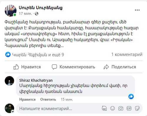 Ֆեյսբուքյան օգտատեր Շիրազ Խաչատրյանը կարծում է որ Փաշինյանը մարդկանց հիշողության չիպերն է փորձում վառել, որ վերջնական դառնան անասուն