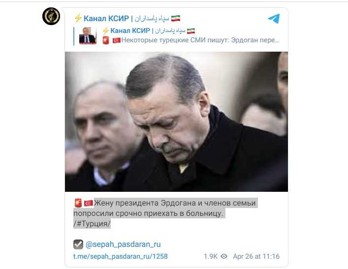 Նշենք, որ ԻՀՊԿ տելեգրամյան ալիքը ավելի վաղ հայտնել է՝ Էրդողանի կնոջը և ընտանիքի մյուս անդամներին խնդրել են շտապ գալ հիվանդանոց։