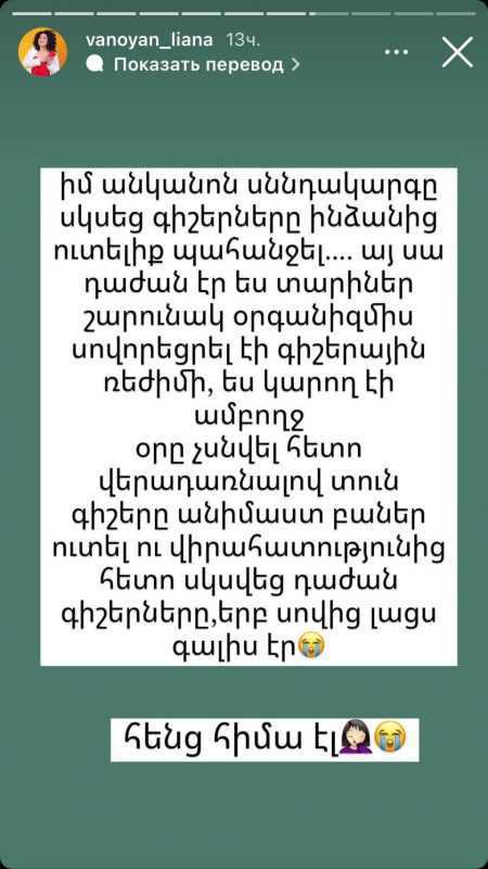 Դերասանուհի Լիանա Վանոյանն ինստագրամյան իր էջի «Սթորի» բաժնում հրապարակել է տեղեկություն, որ իրականացրել է ստամոքսի երկայնակի մասնահատում, որից անցել է 16 օր: