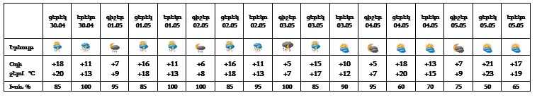 Ապրիլի 30-ի ցերեկը, մայիսի 1-3-ը սպասվում է անձրև և ամպրոպ։ Մայիսի 4-5-ը սպասվում է առանց տեղումների եղանակ։ Ամպրոպի ժամանակ՝ քամու ուժգնացում՝ 13-16 մ/վ արագությամբ։