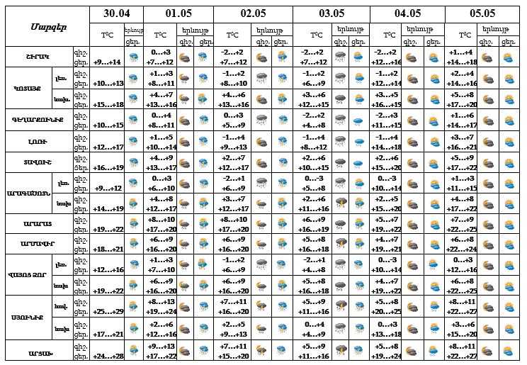 Ապրիլի 30-ի ցերեկը, մայիսի 1-3-ը շրջանների զգալի մասում, 4-ին առանձին շրջաններում սպասվում է անձրև և ամպրոպ։ Առանձին վայրերում հնարավոր է նաև կարկուտ։ Մայիսի 5-ին սպասվում է առանց տեղումների եղանակ։
