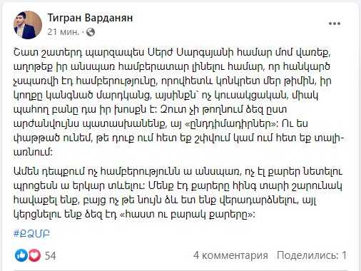 Զուտ չի թողնում ձեզ ըստ արժանվույնս պատասխանենք, այ «ընդդիմադիրներ»: Ու ես փաթթած ունեմ, թե դուք ում հետ եք շփվում կամ ում հետ եք տալի-առնում:
