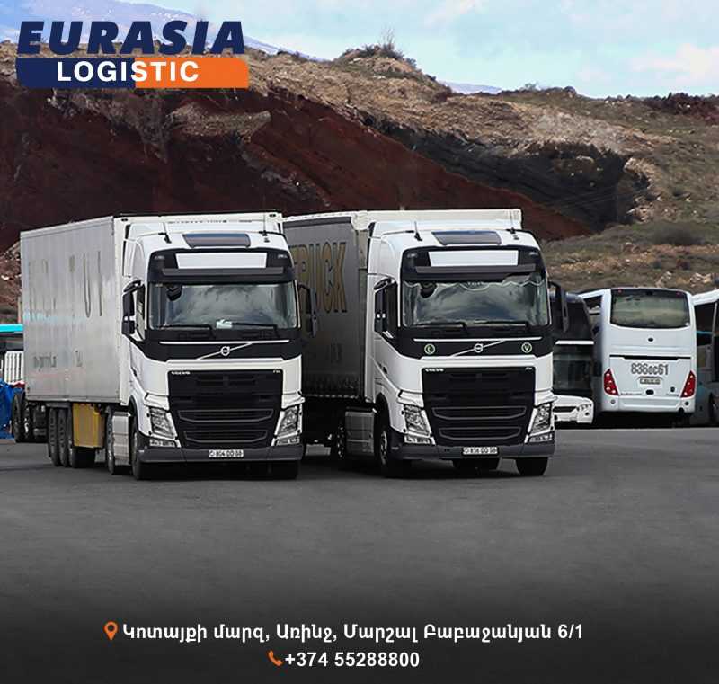 Եվրասիա լոգիստիքը բեռնափոխադրումներով զբաղվող ընկերություն է, որը ձեր ցանկացած ծավալի բեռ ժամանակին, պարտաճանաչորեն և հուսալիորեն կհասցնի ինչպես Հայաստանի մարզեր, այնպես էլ եվրոպական և ԱՊՀ երկրներ: Կազմակերպության շարժակազմը համալրված է VOLVO մակնիշի ավելի քան 30 փոխադրամիջոցով, որոնք համապատասխանում են միջազգային ստանդարտներին, վերազինված են կապի և վերահսկման նորագույն համակարգերով ,դրանցում առկա են ջերմասենսորներ, որոնք թույլ են տալիս տվյալ բեռի փոխադրման համար սահմանել պահանջվող համապատասխան ջերմաստիճանը և ճանապարհ դուրս գալ: