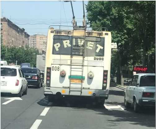 Եթե Ավինյան Տիգրանը ողջամիտ բացատրություն տա, թե ինչու է Երևանի տրոլեյբուսների վրա լատինատառ «PRIVET» բառը գրված, ապա վերջինիս խոստանում եմ հայատառ և մեծատառ ԲԱՐԵՎ ուղարկել:
