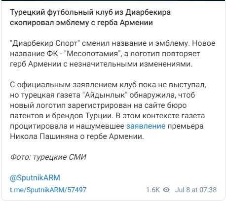 Թուրքական «Դիարբեքիր սպորտ» ֆուտբոլային ակումբը փոխել է անվանումն ու զինանշանը ՝ պատճենելով այն Հայաստանի զինանշանից։ Ակումբի նոր անվանումն է «Միջագետքի մարզական ակումբ», իսկ նոր լոգոն կրկնում է Հայաստանի զինանշանը աննշան փոփոխություններով: