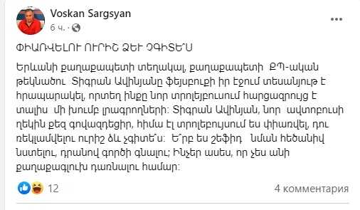 Տիգրան Ավինյան, նոր ավտոբուսի ղեկին քեզ գովազդեցիր, հիմա էլ տրոլեբույսում ես փիառվել, դու ռեկլամվելու ուրիշ ձև չգիտե՞ս։ Ե՞րբ ես շեֆիդ նման հեծանիվ նստելու, դրանով գործի գնալու; Ինչեր ասես, որ չես անի քաղաքագլուխ դառնալու համար։