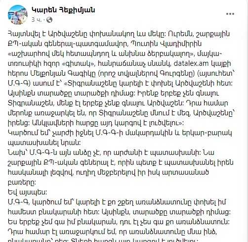 Հայտնվել է Արծվաշենը փոխանակող ևս մեկը: Ուրեմն, շարքային ՔՊ-ական գեներալ-պատգամավոր, Պուտին Վլադիմիրին «աշխարհով մեկ հետապնդող և անխնա ձերբակալող», մայկա-տռուսիկի հզոր «գիտակ», հանրաճանաչ սնանկ, datalex.am կայքի հերոս Մելքոնյան Գագիկը (որոշ տվյալներով Գուրգենը) (այսուհետ՝ Մ.Գ-Գ) ասում է՝ «Տիգրանաշենը կարելի է փոխել Արծվաշենի հետ: Այսինքն տարածքը տարածքի դիմաց: Իրենք երբեք չեն գնալու Տիգրանաշեն, մենք էլ երբեք չենք գնալու Արծվաշեն: Դրա համար մերոնք առաջարկել են, որ Տիգրանաշենը մնում է մեզ, Արծվաշենը՝ իրենց: Անկլավների հարցը այդ կարգով է լուծվելու»: