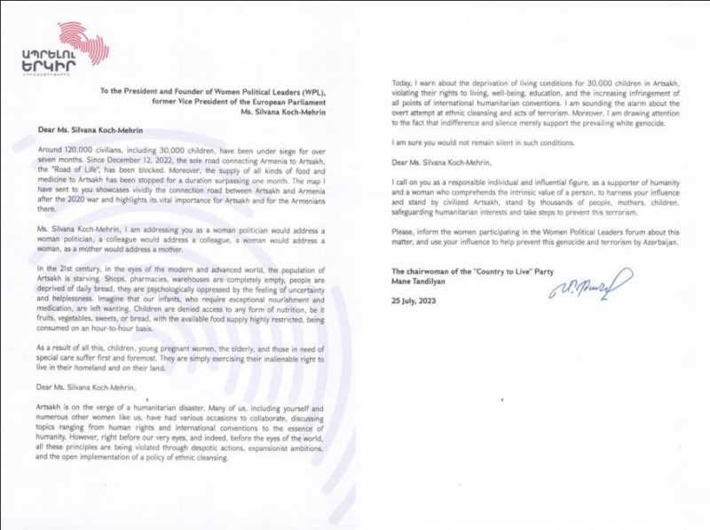 Արցախը հումանիտար աղետի եզրին է։ Ես, Դուք, մեզ նման բազմաթիվ այլ կանայք շատ առիթներ ենք ունեցել միասին համագործակցելու, խոսելու մարդու իրավունքների, միջազգային կոնվենցիաների և պարզապես մարդասիրության մասին։ Իսկ այսօր մեր, աշխարհի ու նաև Ձեր աչքի առջև այս ամենը խախտվում է բռնատիրական գործելաոճով, ծավալապաշտական նկրտումներով, էթնիկ զտման և ցեղասպանության բացահայտ քաղաքականությամբ։