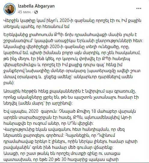 Երևանի ավագանու «Իմ քայլը» խմբակցության նախկին անդամ Իզաբելլա Աբգարյանը շոկային գրառում է արել, պարզաբանելով թե 2020֊ի գարնանը, ի դեպ երբ երբ ՔՊ-ն ծաղում էր, ինքը ինչու լքեց ՔՊ-ն․