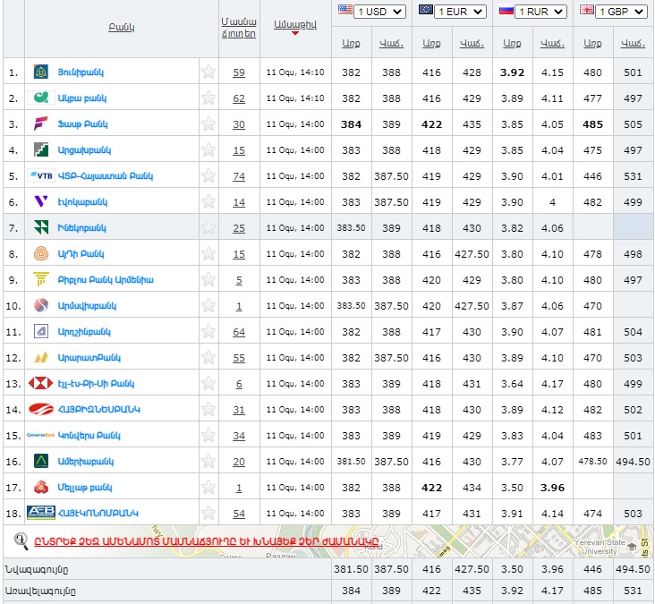 Ռուսական ռուբլին ընդունվում է 3,83 դրամով, վաճառվում՝ 4,09 դրամով։