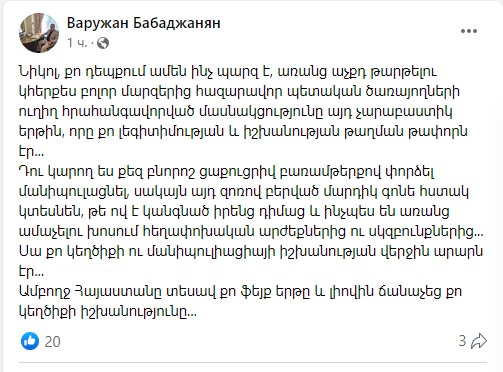 Դու կարող ես քեզ բնորոշ ցաքուցրիվ բառամթերքով փորձել մանիպուլացնել, սակայն այդ զոռով բերված մարդիկ գոնե հստակ կտեսնեն, թե ով է կանգնած իրենց դիմաց և ինչպես են առանց ամաչելու խոսում հեղափոխական արժեքներից ու սկզբունքներից…