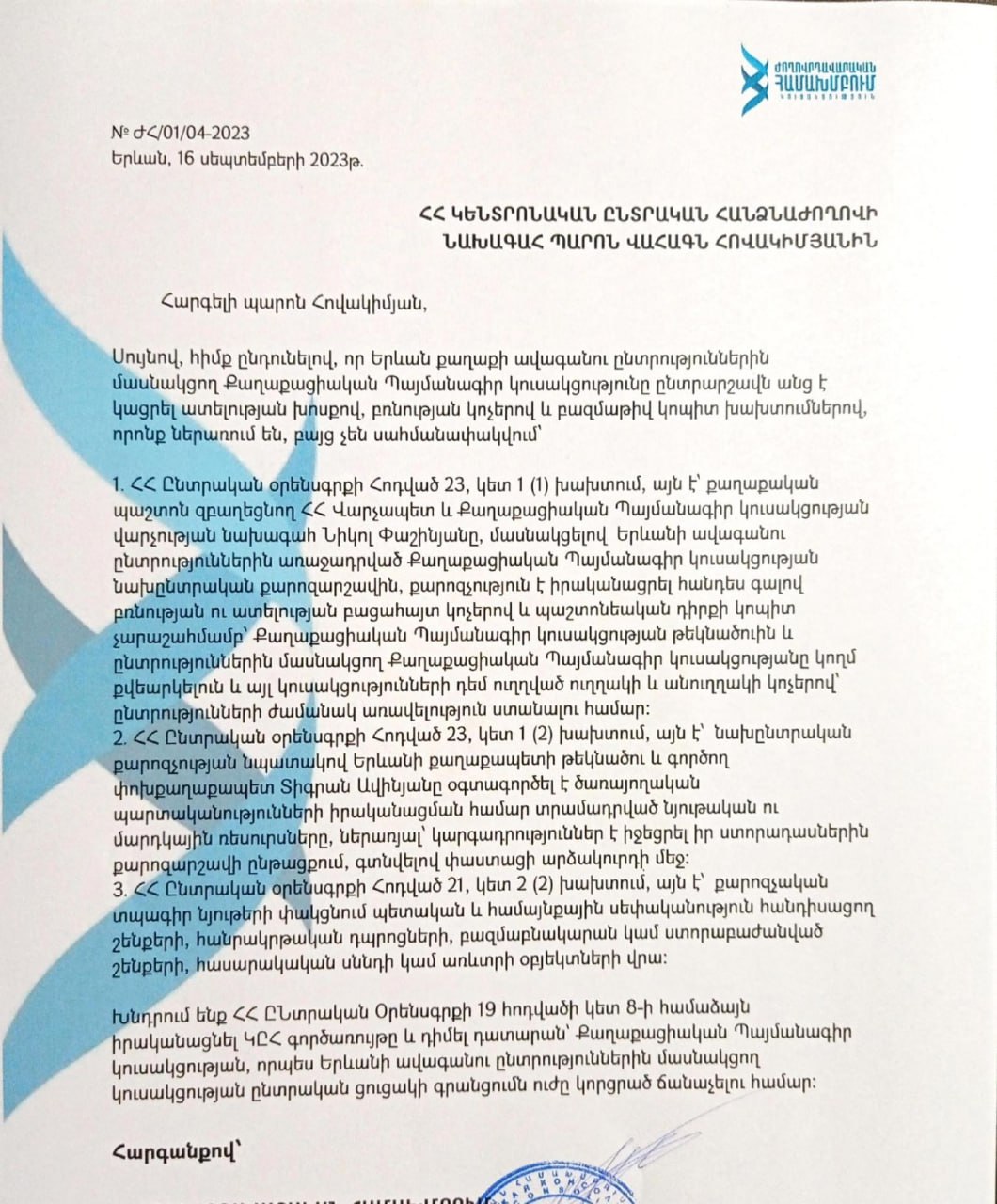 Հիմք ընդունելով սեպտեմբերի 15-ին Երևանի ավագանու ընտրություններին մասնակից ՔՊ կուսակցության նախագահ Նիկոլ Փաշինյանի քարոզարշավային ելույթում հնչեցրած ատելության և բռնության կոչերը, Ժողովրդավարական Համախմբում կուսակցությունն ընտրախախտումների վերաբերյալ դիմում է ներկայացրել ԿԸՀ։
