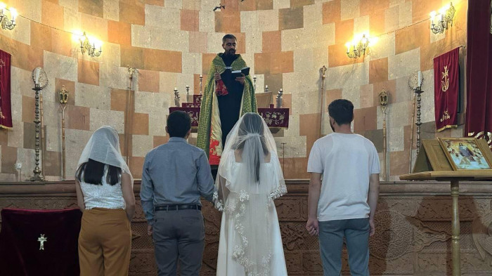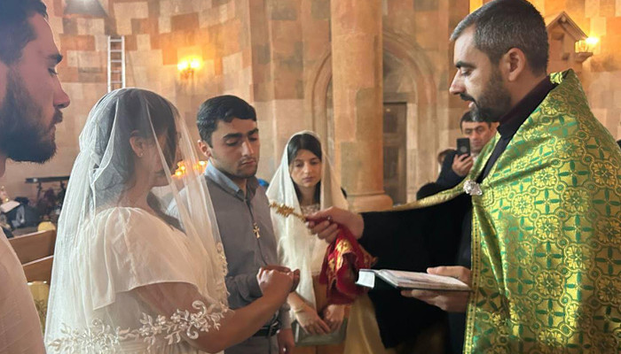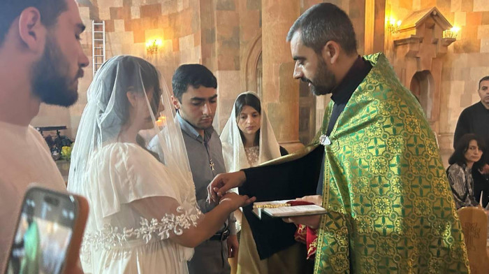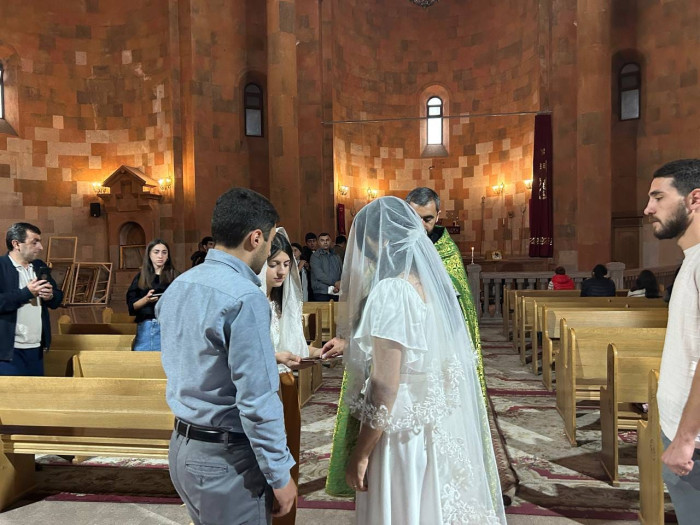 Ստեփանակերտի Սուրբ Աստվածածին առաջնորդանիստ եկեղեցում հարսանիք է տեղի ունեցել: «Նրանք ցանկացել են ամուսնանալ Արցախում»,- գրել է օգտատեր Աննա Մանգասարյանը՝ կցելով լուսանկարներ:
