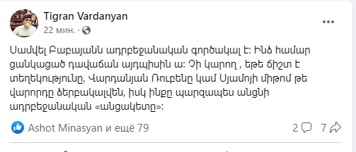 Սամվել Բաբայանն ադրբեջանական գործակալ է: Ինձ համար ցանկացած դավաճան այդպիսին ա: Չի կարող , եթե ճիշտ է տեղեկությունը, Վարդանյան Ռուբենը կամ Սյամոյի միթոմ թե վարորդը ձերբակալվեն, իսկ ինքը պարզապես անցնի ադրբեջանական «անցակետը»: