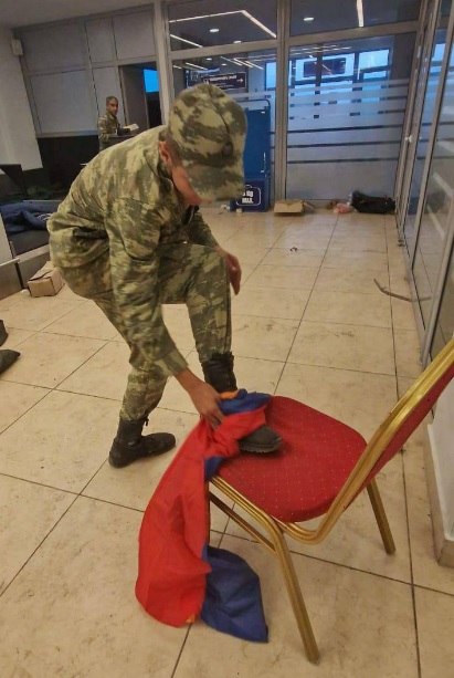 Անդրբեջանցի զինվորականն օկուպացված Ստեփանակերտի օդանավակայանում, կա՛մ Հայաստանի, կա՛մ Արցախի դրոշով (քանի որ լուսանկարում չի երևում) սրբում է իր կոշիկները: