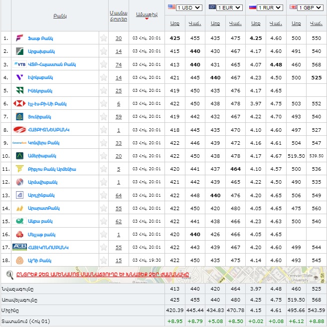 Եվրոյի փոխարժեքը կազմել է 433.09 դրամ (աճել է 9.24 դրամով), բրիտանական ֆունտի փոխարժեքը կազմել է 498.54 դրամ (աճել է 9.57 դրամով), իսկ ռուսական ռուբլու փոխարժեքը կազմել է 4.17 դրամ (աճել է 0.10 դրամ):
