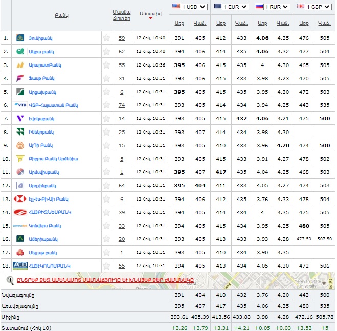 Հոկտեմբերի 11-ի համեմատ դոլարի վաճառքի փոխարժեքը ավելացել է 3.79 դրամով։ Եվրոն գնում են նվազագույնը 405 դրամով, առավելագույնը՝ 415 դրամով։