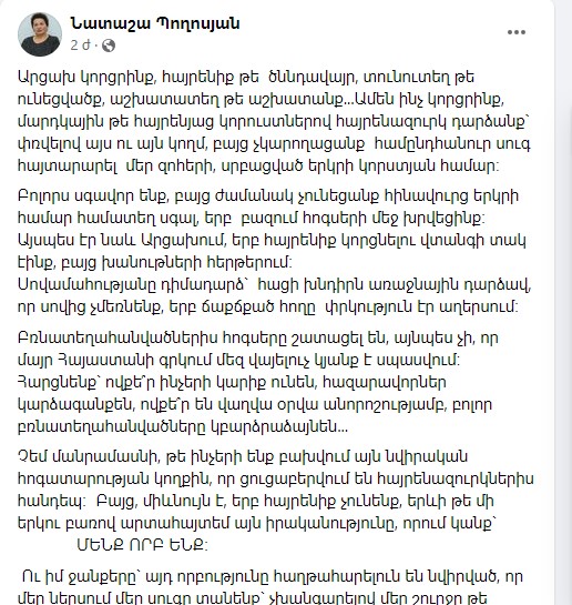 Արցախ կորցրինք, հայրենիք թե ծննդավայր, տունուտեղ թե ունեցվածք, աշխատատեղ թե աշխատանք…Ամեն ինչ կորցրինք, մարդկային թե հայրենյաց կորուստներով հայրենազուրկ դարձանք` փռվելով այս ու այն կողմ, բայց չկարողացանք համընդհանուր սուգ հայտարարել մեր զոհերի, սրբացված երկրի կորստյան համար։